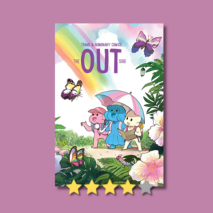 The Out Side: Trans & Nonbinary Comics is a collection of 29 artists sharing personal stories of identity, self-discovery, and acceptance. The different comics highlight the wide spectrum of gender experiences rather than a singular voice, each through varied artistic and storytelling styles. The book balances emotional honesty with affirmation, offering readers insight into individual journeys while expressing empathy and self-love.